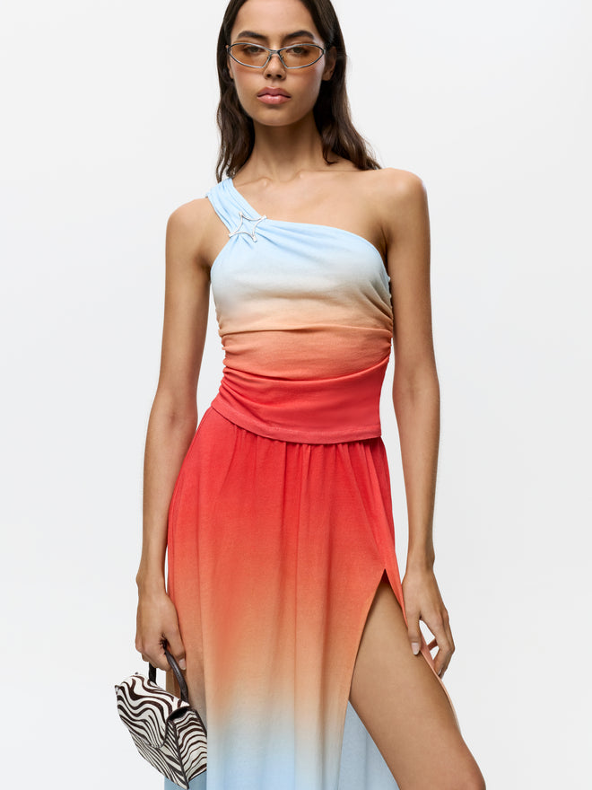 Crafted from a soft, slubbed cotton jersey, the Bang Bang skirt is printed in a custom ombré print, designed to mirror the Bang Bang top for a long-line silhouette.