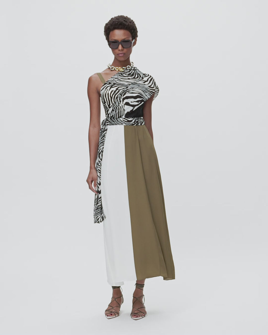 A modern take on the classic slip dress, combining unexpected colour pairings with a printed scarf for styling.