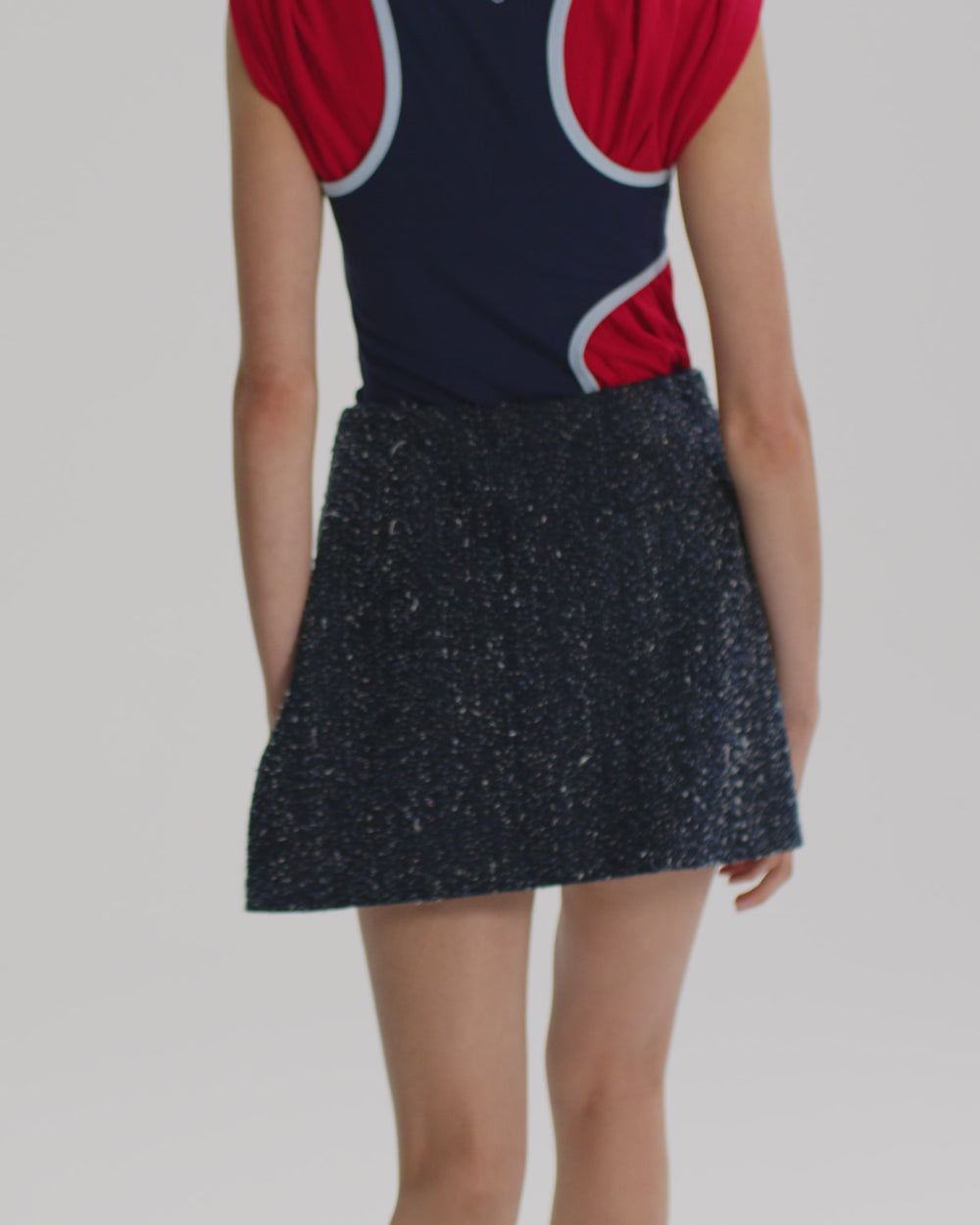 This intricate fabrication provides an interesting textural depth to this modern yet timeless silhouette. Designed with functional side pockets, invisible zip, and faux skirt overlaying panel.